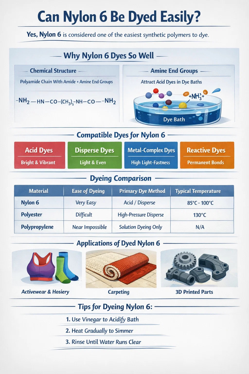 Ita, Nylon 6 consideretur unum facillimum synthetica polymerorum tingere praesertim cum aliis materiatis comparatis sicut polyester vel polypropylene. Eius unica structura chemica numerosas reactivas sites continet, quae moleculas tingunt ut vincula validos, permanentes efforment. Haec alta affinitas colorantium significat quod Nylon 6 consequi potest venusta, altum colorem et colorem optimum velocitatem vexillum utens processibus aqueis tingendis ad temperaturas relative humilis.