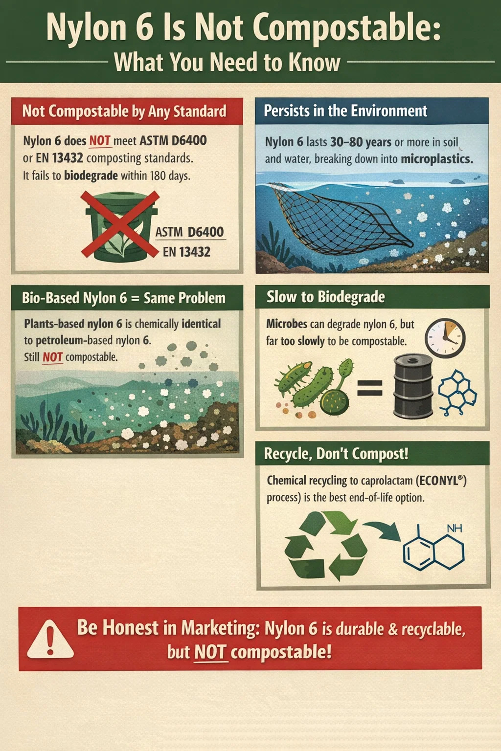 - Ne producta pittacia nylon 6 continentes sicut compostabiles, biodegradabiles, vel "reverti ad naturam" — hoc improprium est et in multis mercatis violatio regulatoriae sub viridi legum latione constituit.