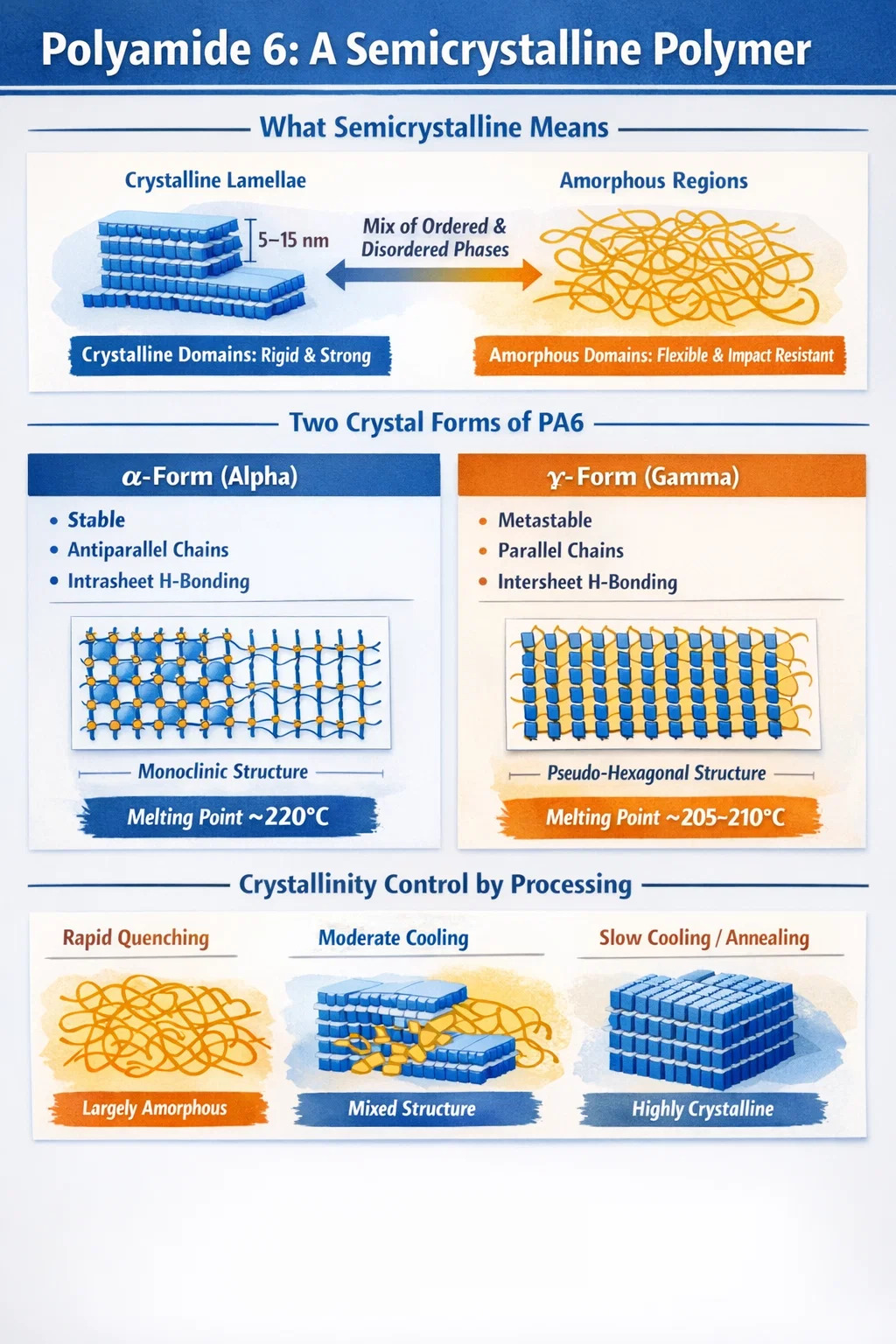 Polyamide 6 in unicam crystalli fabricam non crystallizet. Polymorphismum cristallinum exhibet, id est varias cristallinas structuras formare posse, quae polymorphs vocantur — secundum quomodo discursum est. Duo primaria polymorpha sunt alpha (α) forma et forma gamma (γ), singula cum dispositionibus atomicis distinctis et consequentibus mechanicis.
