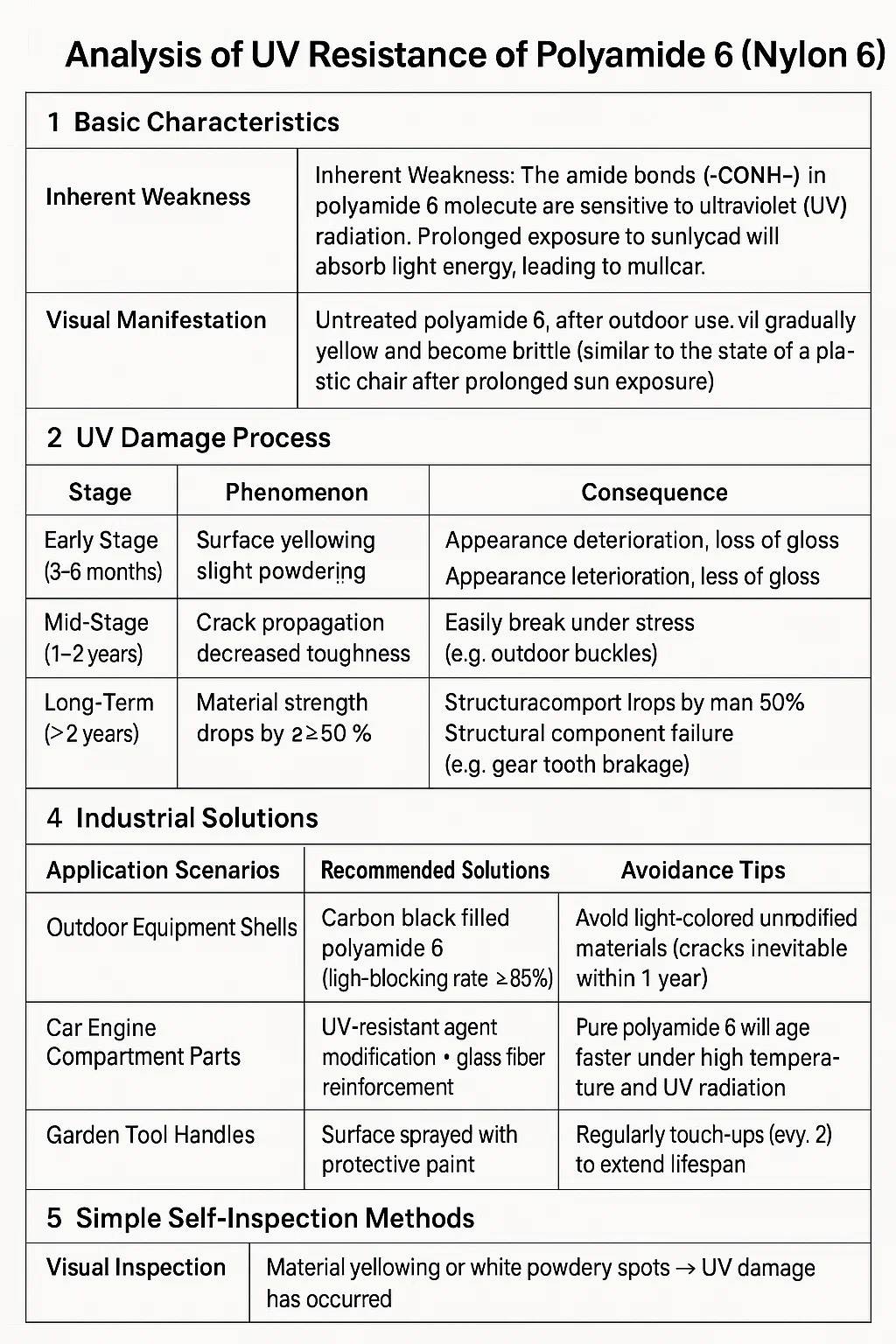 Infirmitas inhaerens: Vincula amid (-CONH-) in polyamide VI " moleculo sensitiva ad radiorum ultraviolaticum (UV) sunt. Longa detectio ad solis lumen trahet industriam, ducens ad hypotheticam catenam fracturam.