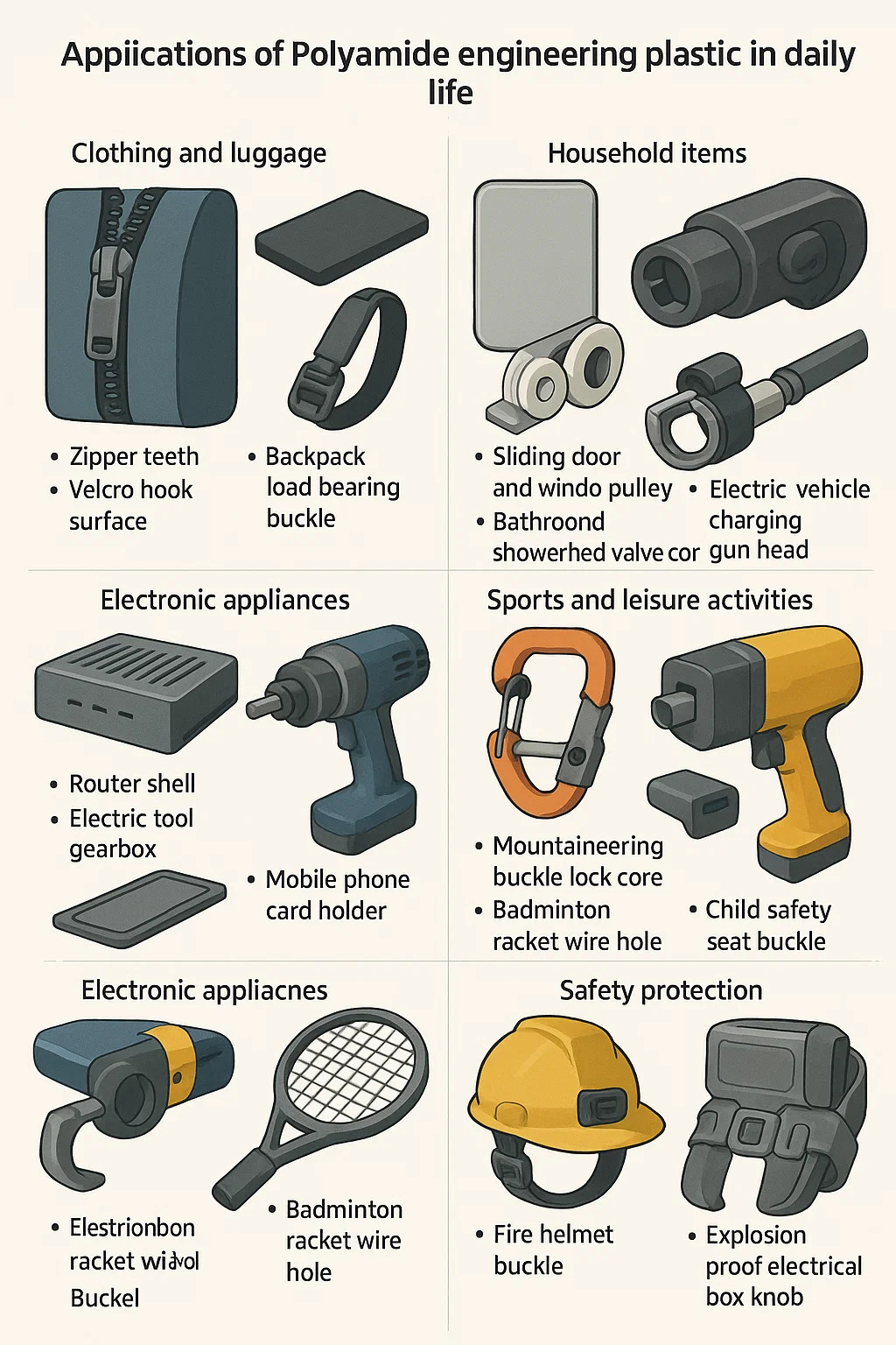Applicationem Engineering Plastic Polyamide In cotidiana vitae permeates multiple agros et core valorem mendacium in characteres de repositoque ferro cum plastic et quod leve et durabile. Propria typical missionibus sunt ut sequitur: