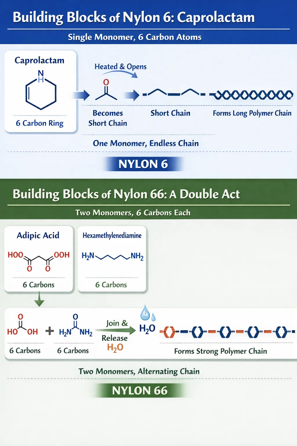 Nomen Nylon tenet secretum rudis materiae. Sic dicti "monomers" sunt caudices structurae fundamentales adhibitae ad has longas plasticas catenulas creandas.