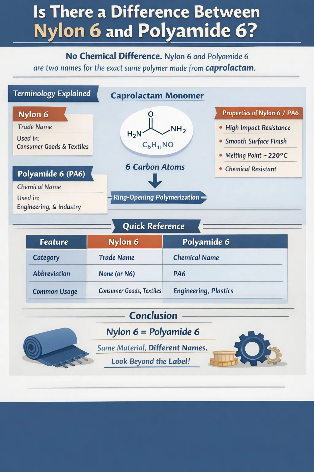 Ut simpliciter, Nulla differentia chemica inter Nylonem et 6 Polyamidem. Nam polymerum eadem sunt duo diversa nomina. "Nylon" est nomen artis notum a DuPont or *iginaliter signatum, cum "Polyamide" est nomen chemicum formale in scientia et machinatione adhibitum. Cum videris Nylon 6 in dolor productum pittacium ac Polyamide 6 in scheda technica data, referuntur ad eandem materiam e caprolacta monomers factam.