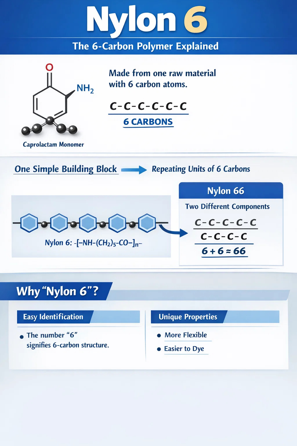 Differentia inter monomer et dimenium: Haec etiam maxima differentia est inter eam et Nylon 66 . Nylon 66 componitur ex duabus diversis materiis crudis, unumquodque continens 6 carbones atomos, unde nomen "66."